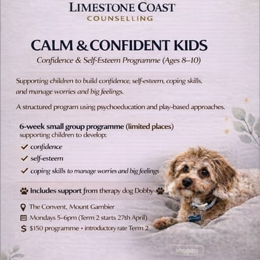 Sessions are tailored to each child’s needs, pace, and strengths, with parent collaboration where helpful. If you are looking for child counselling in Mount Gambier or adolescent support in the Limestone Coast, you are welcome to get in touch. I am also running a limited group session for 8-10 year olds. The details of the next one are below, and bookable from the booking page:
